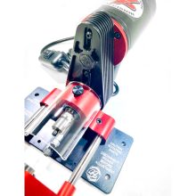 The Gen 3 powered case trimmer uses a powerful DC motor with a speed control unit. The DC motor is extremely smooth and quiet through its RPM range. It offers externally replaceable brushes making brush replacement easy and fast. The speed is adjustable from 0-1700 rpms. Our 3/8-inch-thick aluminum motor mount bolts the motor directly to the bearing housing. We have also designed a custom machined pulley that is belt driven.