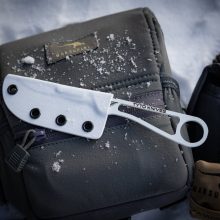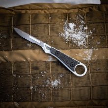 With design help from Aron Snyder this Titanium replacement blade knife is a little beast. The Finisher Ti features grade 5 Titanium with Tactical Grey Cerakote in a compact profile. At 5” inches long it will fit in your bino harness at a weight where you won’t even know it’s there. Includes Kydex sheath and (10) #60 stainless steel blades.