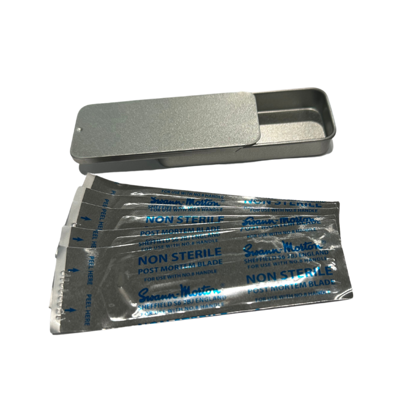 Sliding top tin with 5 Swann Morton #60 blades, best blades in the business and the tin is perfect for holding used blades also. Total weight is 1 ounce for blades and tin.